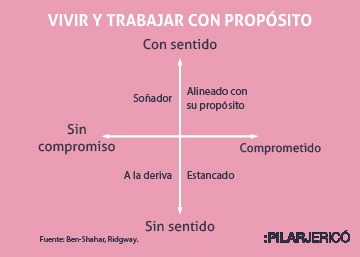 Tal Ben-Shawar y Angus Ridgway en su libro Ser feliz es decisión tuya, analizan los tipos de trabajos conforme a nuestro nivel de sentido o compromiso. El sentido se experimenta cuando existe conexión entre lo que hacemos y nuestros valores, si creo o no en lo que hago. El compromiso es la motivación y energía que ponemos. Conforme a estos dos ejes, podemos ver que existen cuatro opciones: